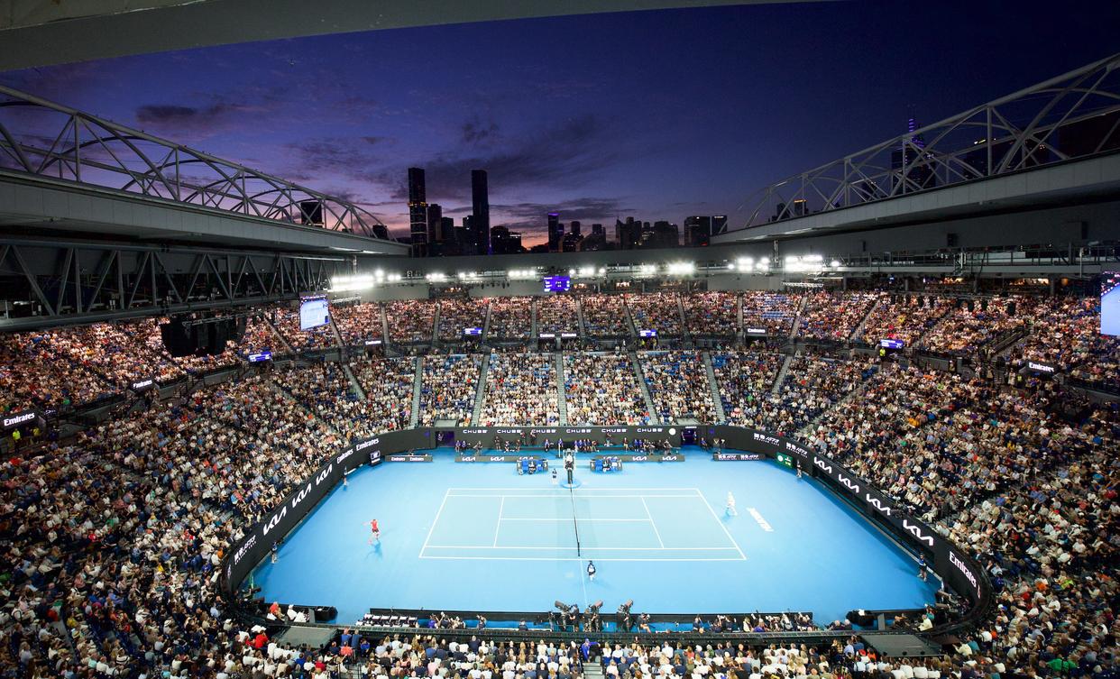 这是1月26日拍摄的比赛现场。当日,在墨尔本进行的2025年澳大利亚网球公开赛男单决赛中,意大利选手辛纳3比0战胜德国选手兹维列夫,夺得冠军。新华社发(胡泾辰摄)