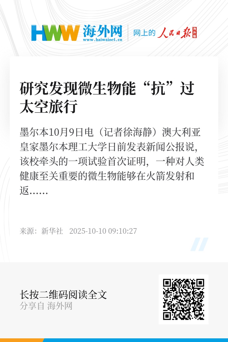 新华社墨尔本10月9日电(记者徐海静)澳大利亚皇家墨尔本理工大学日前发表新闻公报说,该校牵头的一项试验首次证明,一种对人类健康至关重要的微生物能够在火箭发射和返回的极端条件下存活下来。