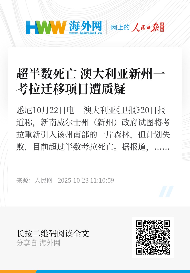 人民网悉尼10月22日电 澳大利亚《卫报》20日报道称,新南威尔士州(新州)政府试图将考拉重新引入该州南部的一片森林,但计划失败,目前超过半数考拉死亡。