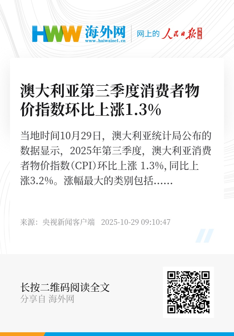 当地时间10月29日,澳大利亚统计局公布的数据显示,2025年第三季度,澳大利亚消费者物价指数(CPI)环比上涨 1.3%,同比上涨3.2%。涨幅最大的类别包括:住房、娱乐与文化和交通。(总台记者 林清辉)