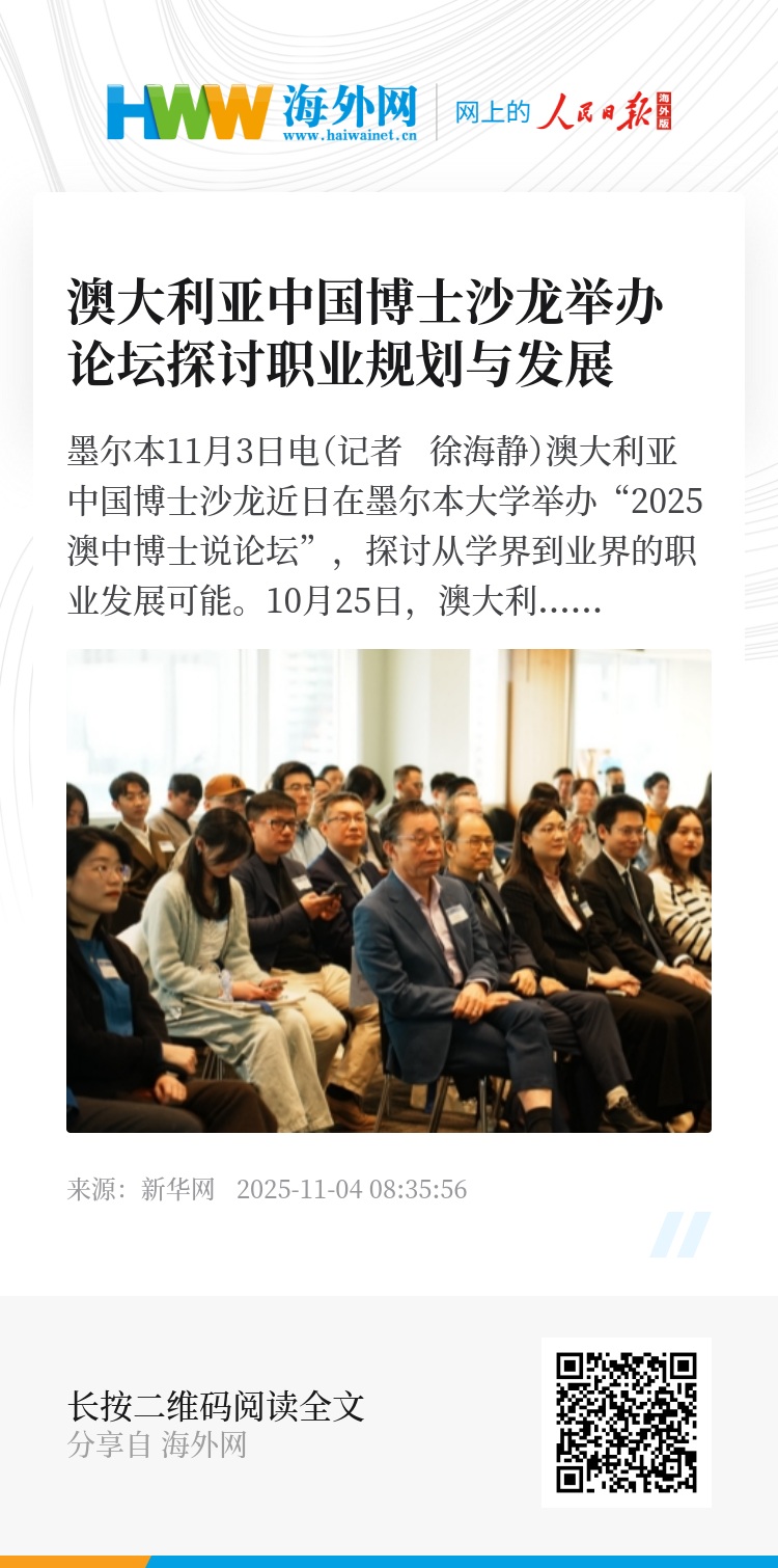 新华网墨尔本11月3日电(记者 徐海静)澳大利亚中国博士沙龙近日在墨尔本大学举办“2025澳中博士说论坛”,探讨从学界到业界的职业发展可能。