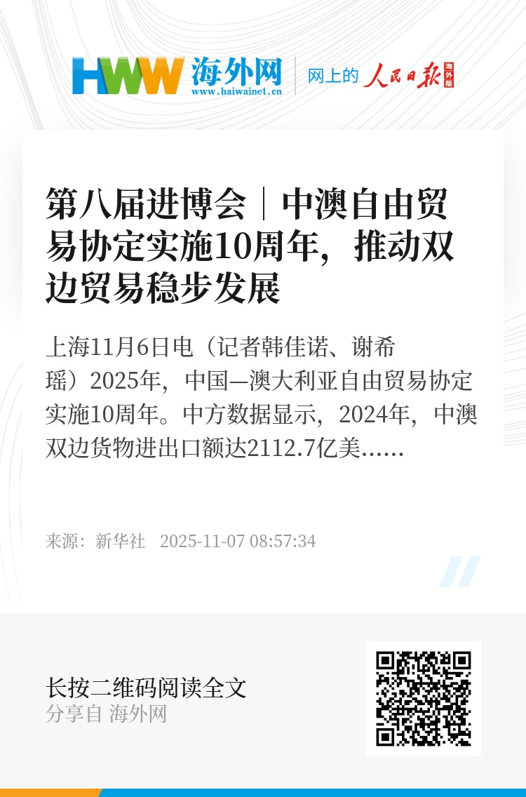 新华社上海11月6日电(记者韩佳诺、谢希瑶)2025年,中国—澳大利亚自由贸易协定实施10周年。中方数据显示,2024年,中澳双边货物进出口额达2112.7亿美元,较2015年增长85.6%。