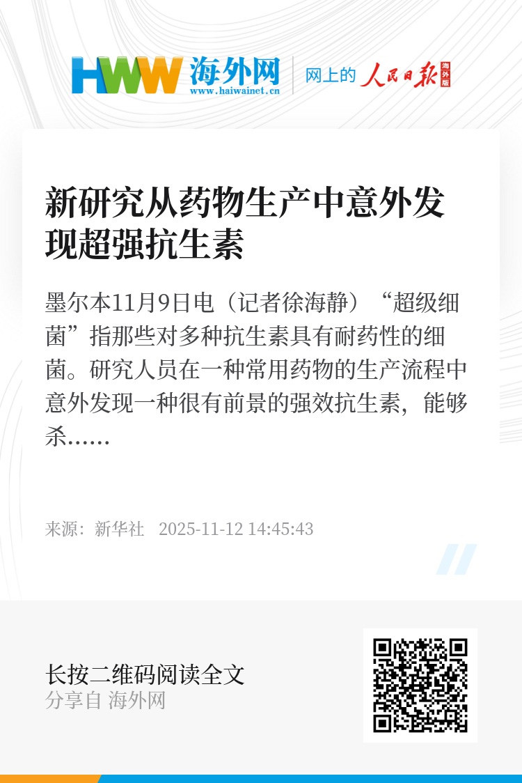 新华社墨尔本11月9日电(记者徐海静)“超级细菌”指那些对多种抗生素具有耐药性的细菌。研究人员在一种常用药物的生产流程中意外发现一种很有前景的强效抗生素,能够杀死耐甲氧西林金黄色葡萄球菌等“超级细菌”。