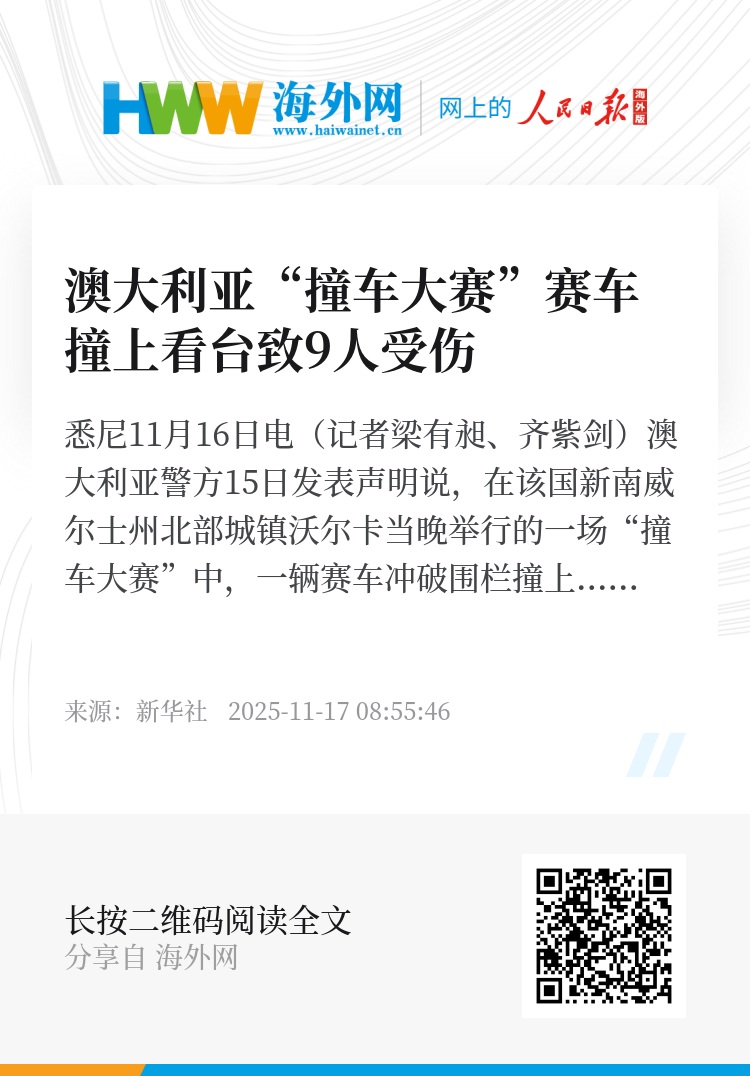 新华社悉尼11月16日电(记者梁有昶、齐紫剑)澳大利亚警方15日发表声明说,在该国新南威尔士州北部城镇沃尔卡当晚举行的一场“撞车大赛”中,一辆赛车冲破围栏撞上看台,造成9人受伤,其中1人伤势危急。