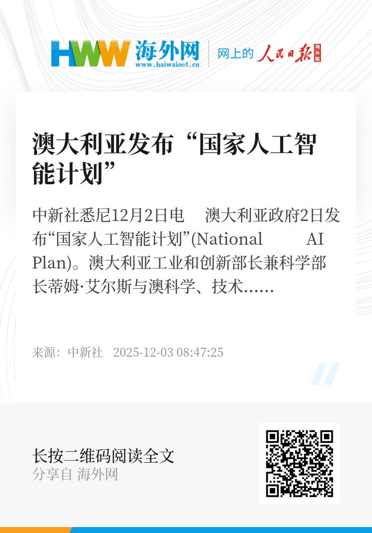 中新社悉尼12月2日电 澳大利亚政府2日发布“国家人工智能计划”(National AI Plan)。