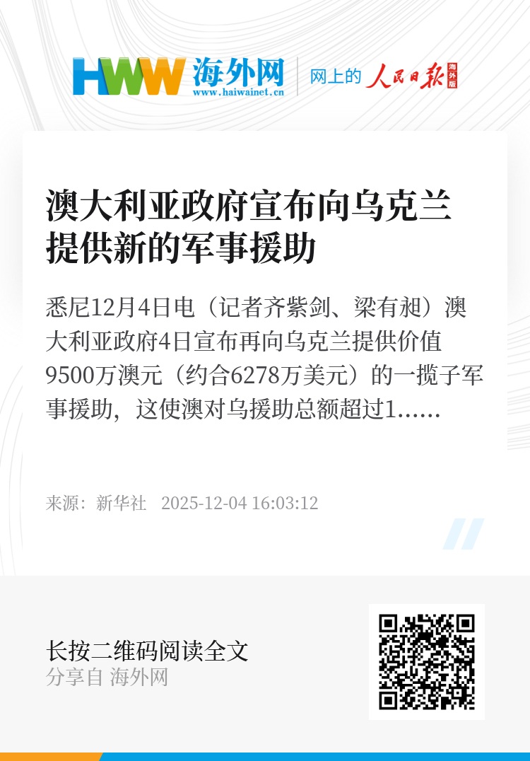 新华社悉尼12月4日电(记者齐紫剑、梁有昶)澳大利亚政府4日宣布再向乌克兰提供价值9500万澳元(约合6278万美元)的一揽子军事援助,这使澳对乌援助总额超过17亿澳元(约合11亿美元)。