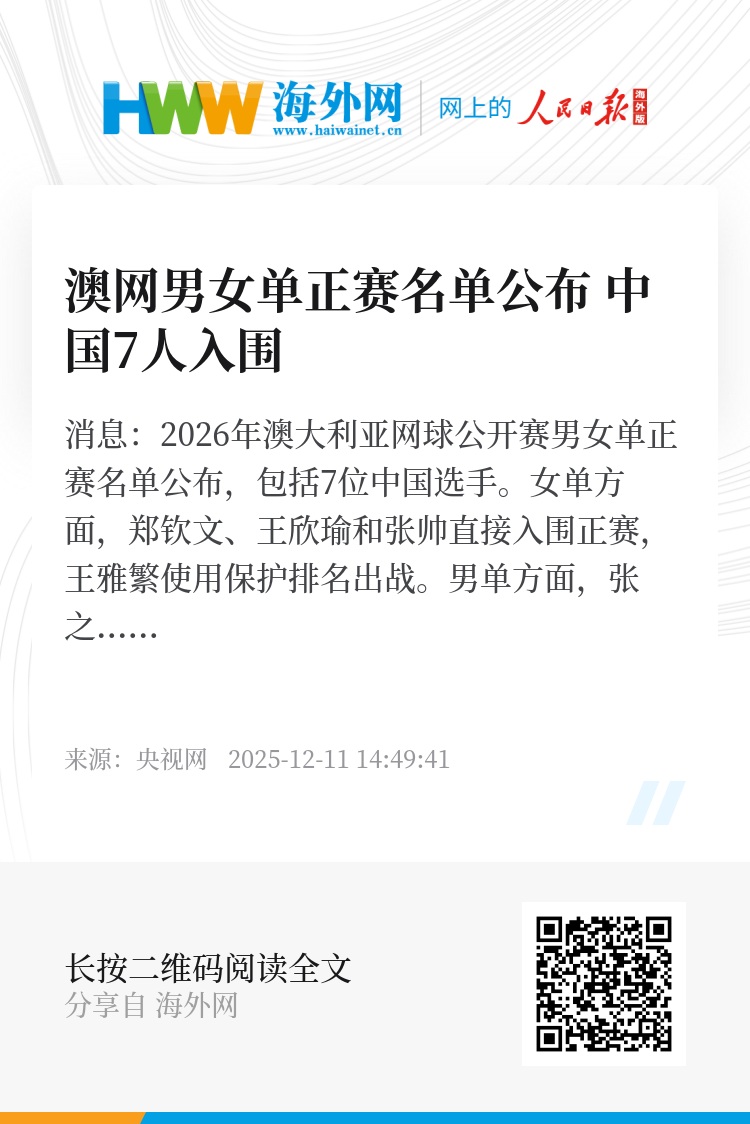央视网消息:2026年澳大利亚网球公开赛男女单正赛名单公布,包括7位中国选手。