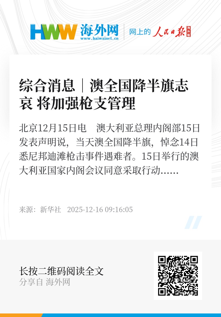 澳总理内阁部的声明说,根据总理阿尔巴尼斯要求,当天澳大利亚全国降半旗,以悼念14日悉尼邦迪滩枪击事件遇难者。