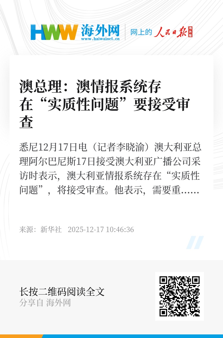 新华社悉尼12月17日电(记者李晓渝)澳大利亚总理阿尔巴尼斯17日接受澳大利亚广播公司采访时表示,澳大利亚情报系统存在“实质性问题”,将接受审查。