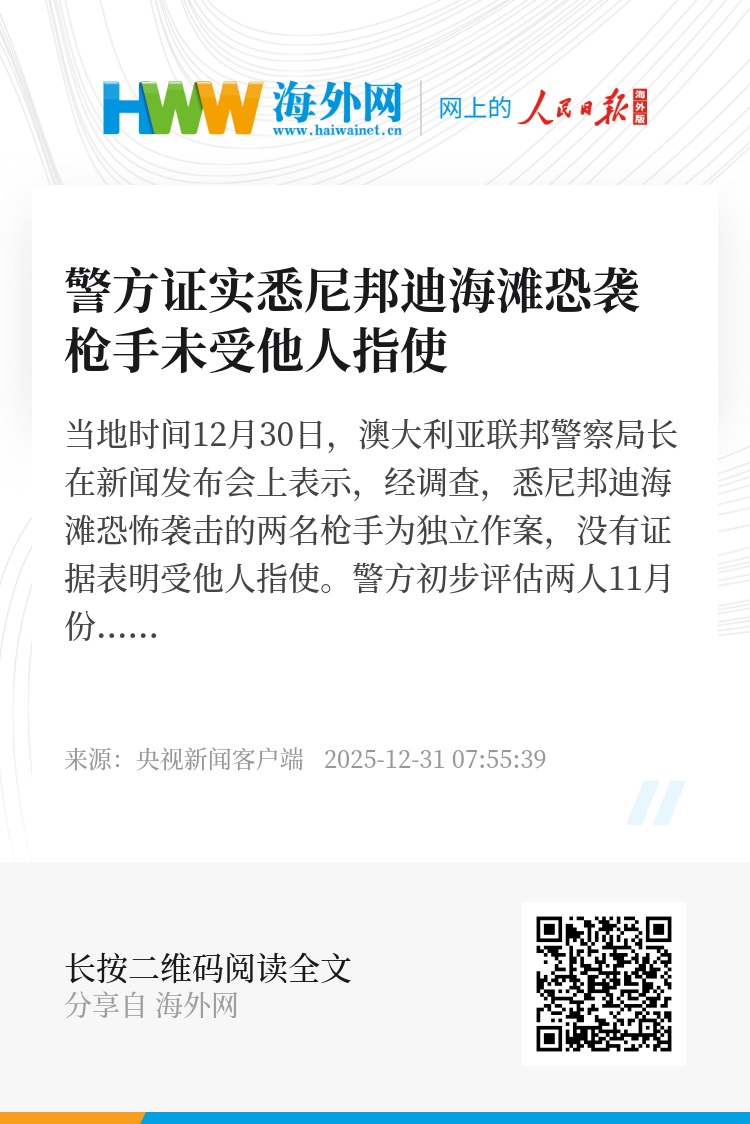 当地时间12月30日,澳大利亚联邦警察局长在新闻发布会上表示,经调查,悉尼邦迪海滩恐怖袭击的两名枪手为独立作案,没有证据表明受他人指使。警方初步评估两人11月份在菲律宾停留期间未进行任何军事训练或“后勤准备”。