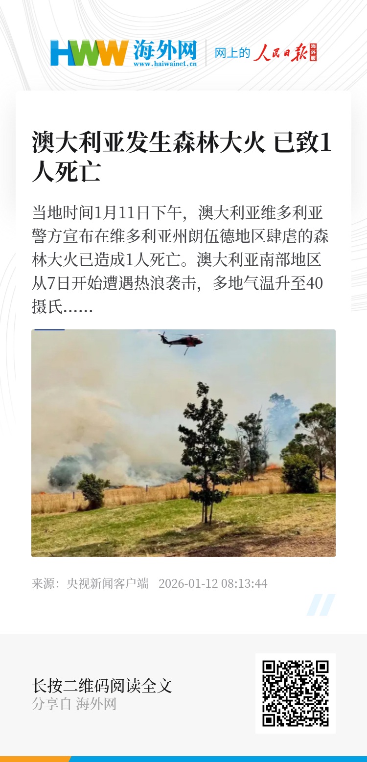 当地时间1月11日下午,澳大利亚维多利亚警方宣布在维多利亚州朗伍德地区肆虐的森林大火已造成1人死亡。