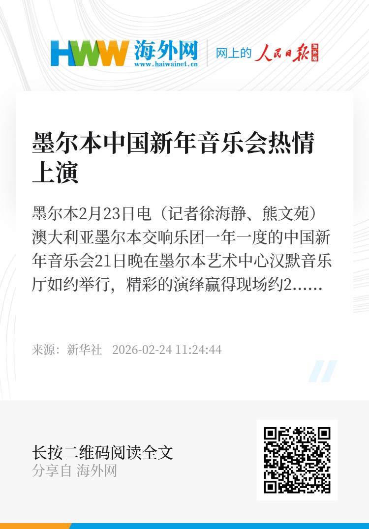 新华社墨尔本2月23日电(记者徐海静、熊文苑)澳大利亚墨尔本交响乐团一年一度的中国新年音乐会21日晚在墨尔本艺术中心汉默音乐厅如约举行,精彩的演绎赢得现场约2400名观众热烈而持久的掌声。