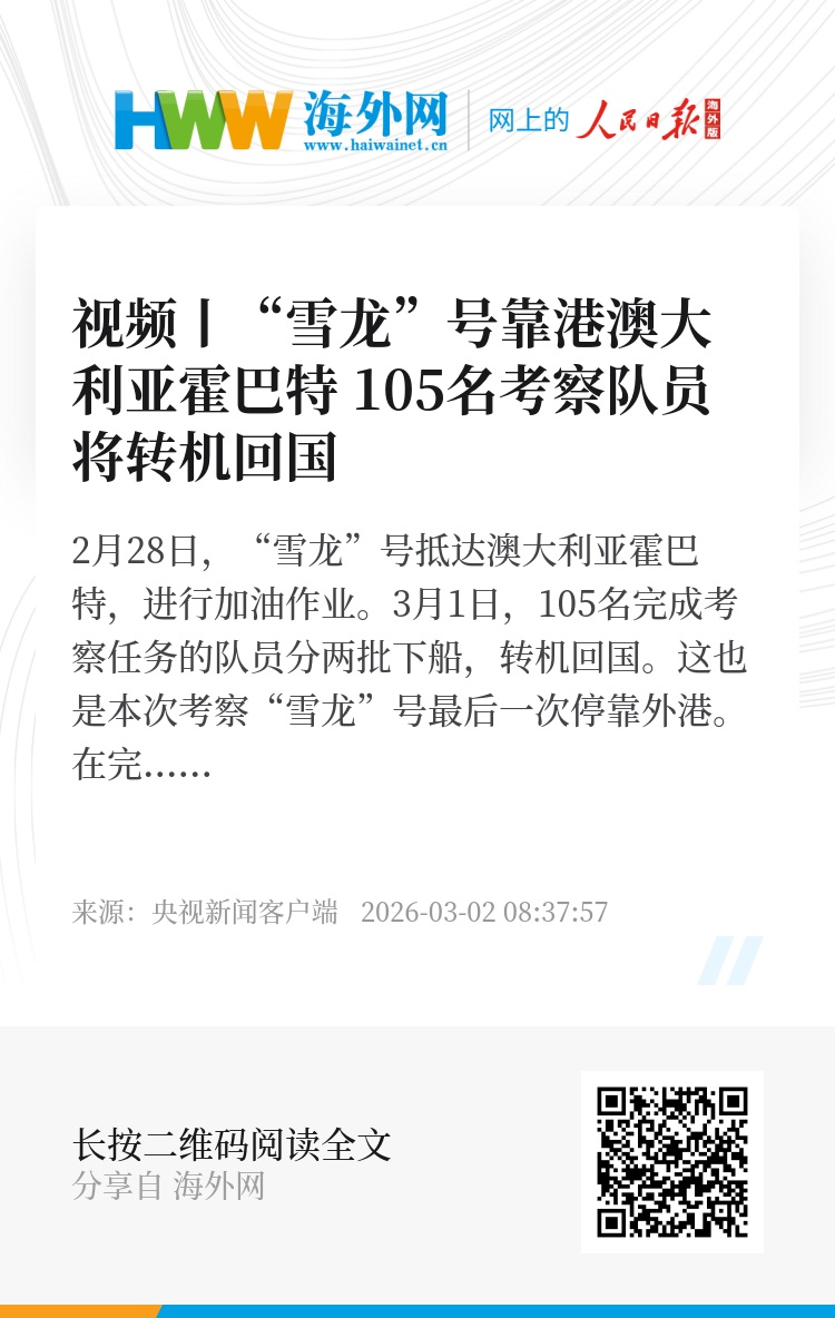 2月28日,“雪龙”号抵达澳大利亚霍巴特,进行加油作业。3月1日,105名完成考察任务的队员分两批下船,转机回国。