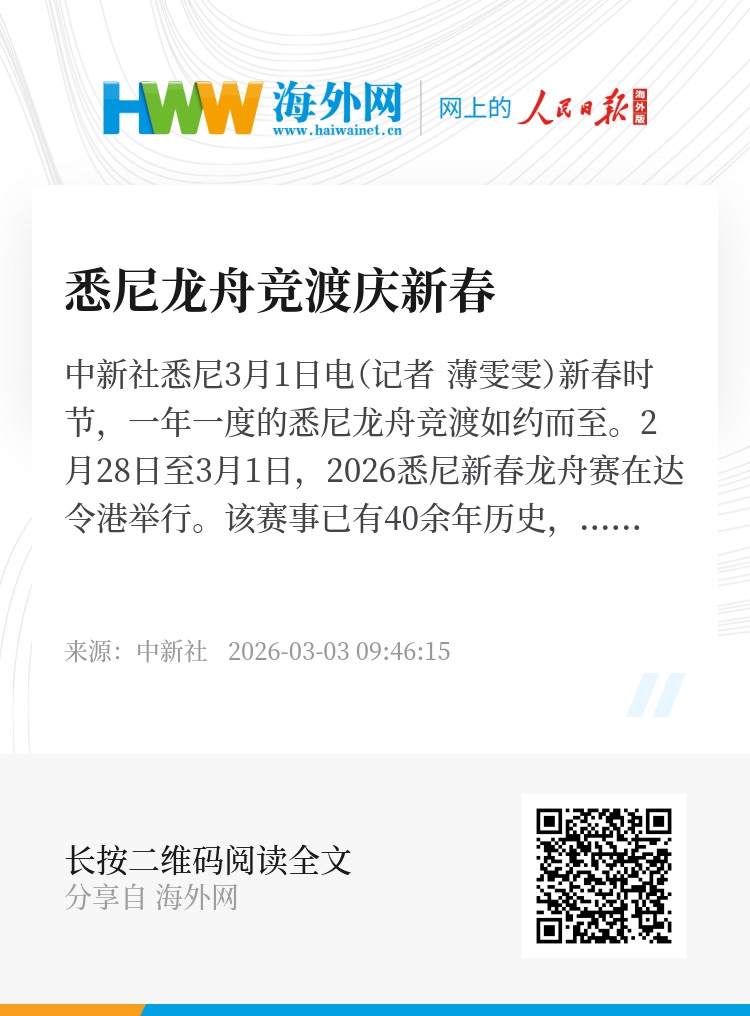 2月28日至3月1日,2026悉尼新春龙舟赛在达令港举行。该赛事已有40余年历史,是悉尼庆祝农历新年的压轴活动,也是南半球规模最大的龙舟赛。