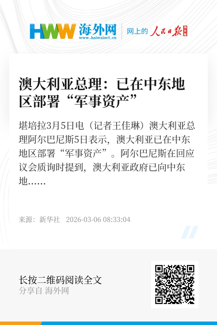 新华社堪培拉3月5日电(记者王佳琳)澳大利亚总理阿尔巴尼斯5日表示,澳大利亚已在中东地区部署“军事资产”。