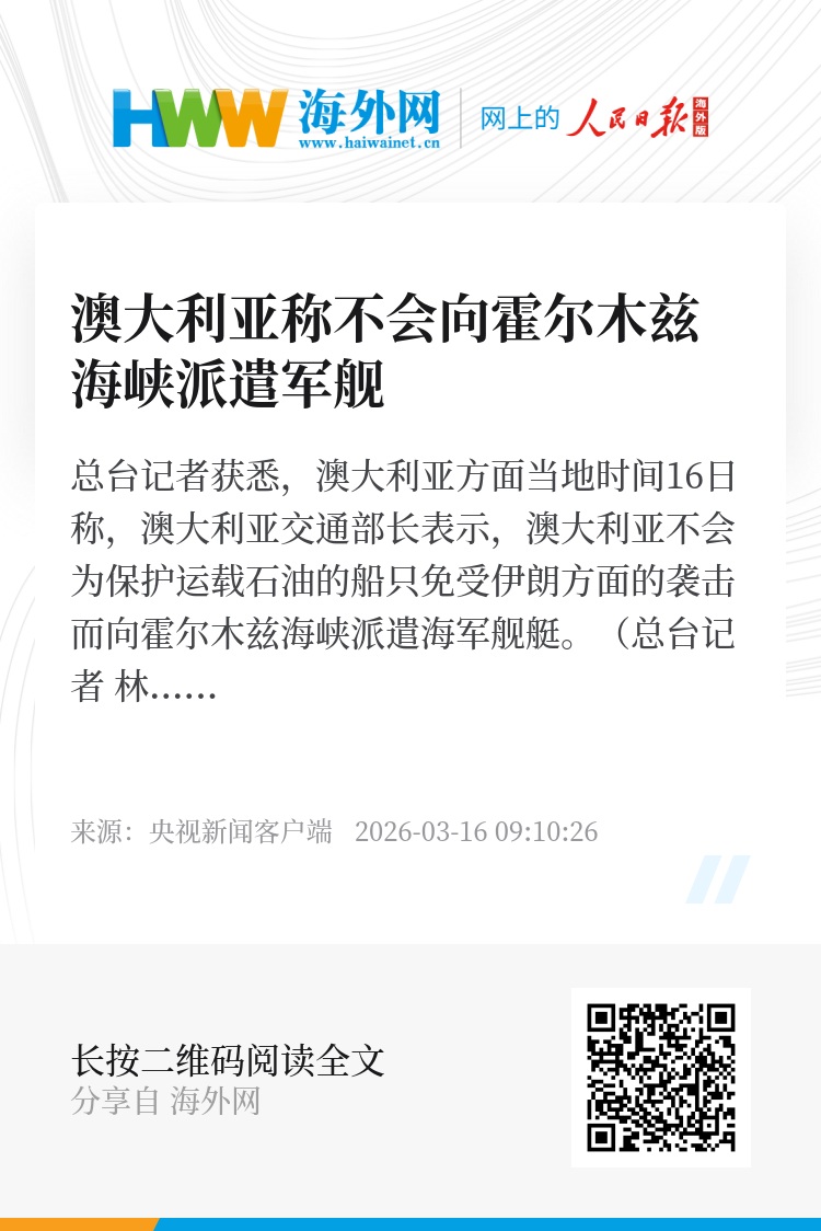 总台记者获悉,澳大利亚方面当地时间16日称,澳大利亚交通部长表示,澳大利亚不会为保护运载石油的船只免受伊朗方面的袭击而向霍尔木兹海峡派遣海军舰艇。(总台记者 林清辉)