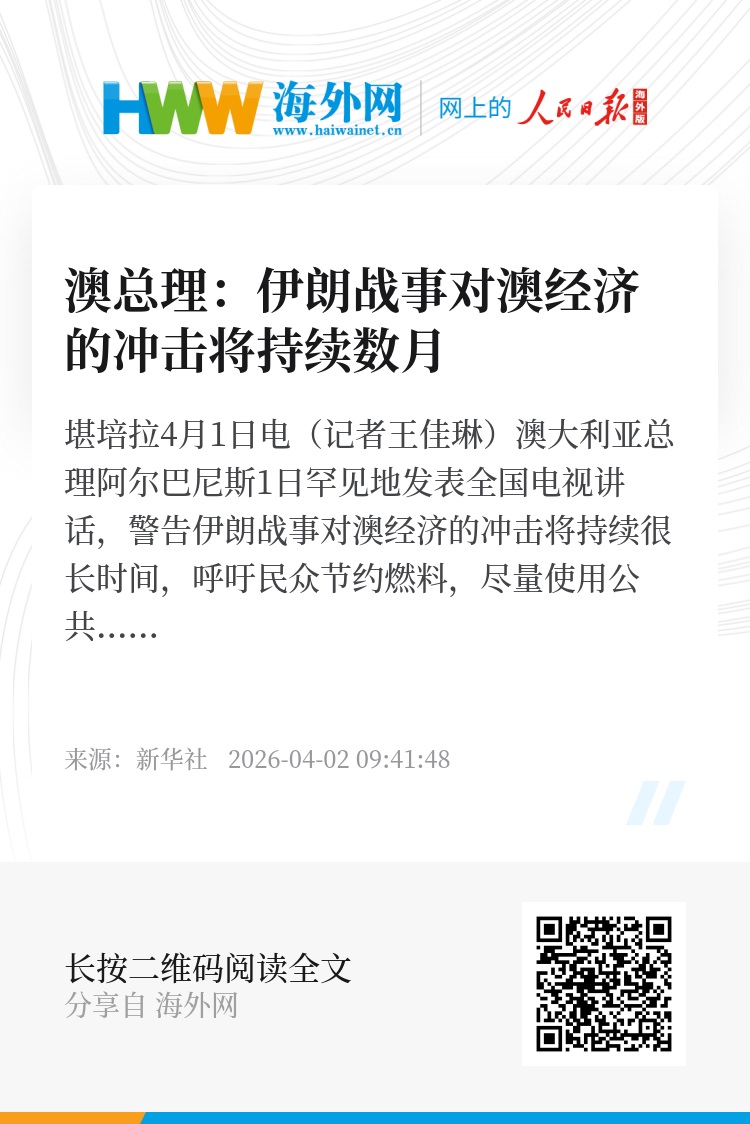新华社堪培拉4月1日电(记者王佳琳)澳大利亚总理阿尔巴尼斯1日罕见地发表全国电视讲话,警告伊朗战事对澳经济的冲击将持续很长时间,呼吁民众节约燃料,尽量使用公共交通出行。