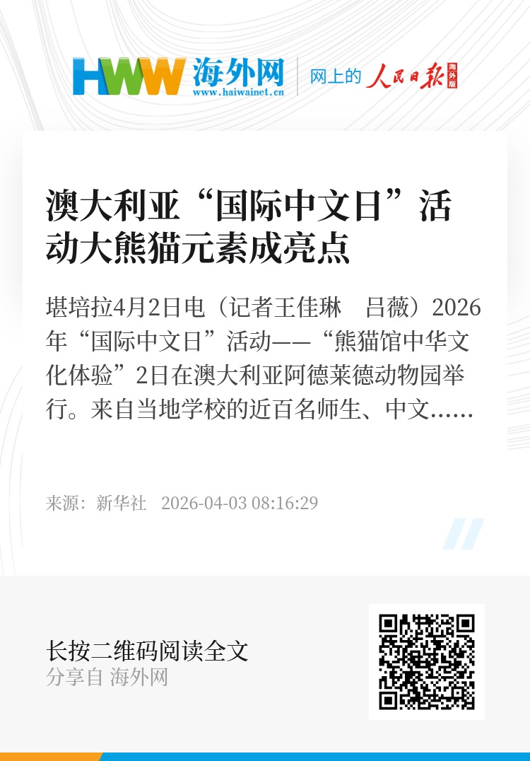 新华社堪培拉4月2日电(记者王佳琳 吕薇)2026年“国际中文日”活动——“熊猫馆中华文化体验”2日在澳大利亚阿德莱德动物园举行。来自当地学校的近百名师生、中文推广志愿者及社区代表齐聚一堂,通过丰富多彩的互动体验,感受中华语言与文化的独特魅力。