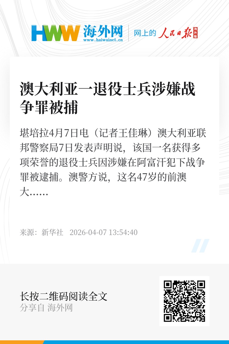 新华社堪培拉4月7日电(记者王佳琳)澳大利亚联邦警察局7日发表声明说,该国一名获得多项荣誉的退役士兵因涉嫌在阿富汗犯下战争罪被逮捕。