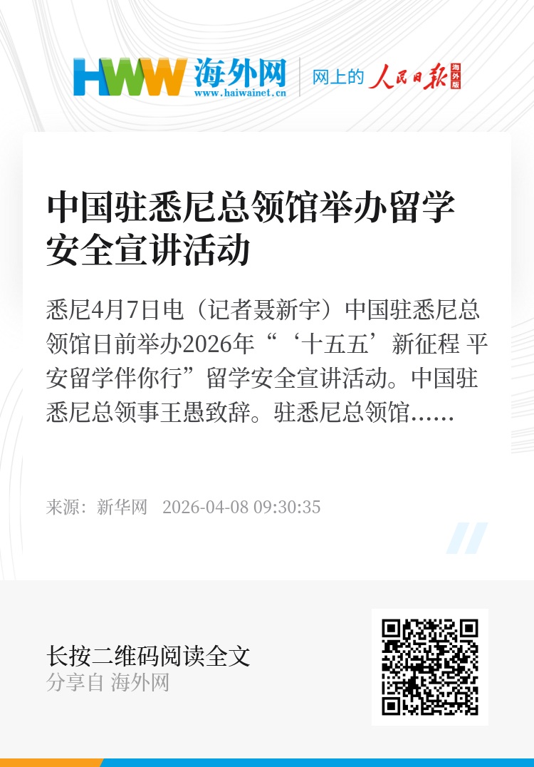 新华网悉尼4月7日电(记者聂新宇)中国驻悉尼总领馆日前举办2026年“‘十五五’新征程 平安留学伴你行”留学安全宣讲活动。