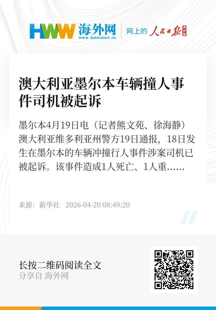 新华社墨尔本4月19日电(记者熊文苑、徐海静)澳大利亚维多利亚州警方19日通报,18日发生在墨尔本的车辆冲撞行人事件涉案司机已被起诉。该事件造成1人死亡、1人重伤。