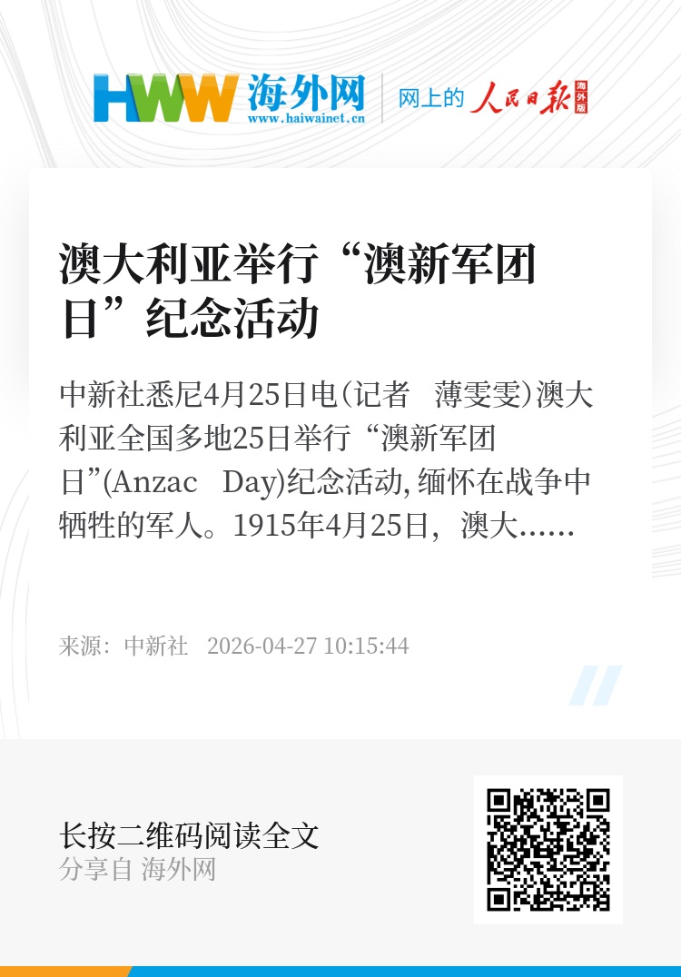 中新社悉尼4月25日电(记者 薄雯雯)澳大利亚全国多地25日举行“澳新军团日”(Anzac Day)纪念活动,缅怀在战争中牺牲的军人。