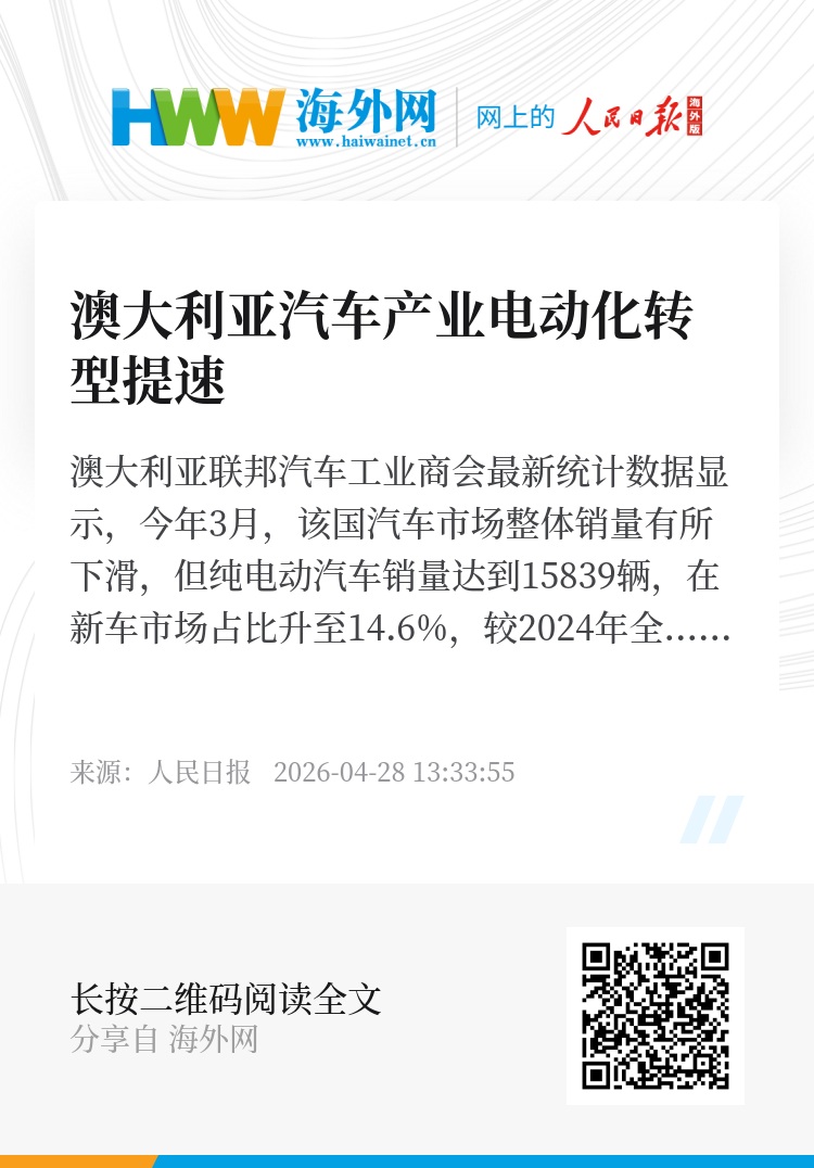 澳大利亚媒体评价称,中国用10余年时间同步培育电动汽车市场供给与需求,其电动化发展优势不仅体现在产业规模,更在于完整的电动汽车生态体系构建。当地汽车交易平台表示,凭借出色的科技配置、可靠的续航表现与高性价比,中国电动汽车品牌正快速获得澳大利亚消费者的青睐。(本报记者 车斌)