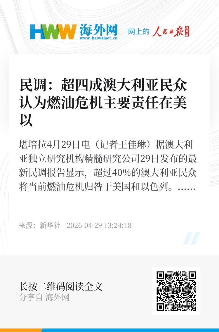 新华社堪培拉4月29日电(记者王佳琳)据澳大利亚独立研究机构精髓研究公司29日发布的最新民调报告显示,超过40%的澳大利亚民众将当前燃油危机归咎于美国和以色列。